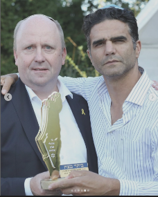 Zur Ehrung haben die drei Rückkehrer jeweils eine Groß-Israel-Trophäe bekommen, also einen Pokal mit einer Kunststoffkarte vom Gesamtgebiet Palästina einschließlich der Golanhöhen - neben dem Westjordanland und dem Gazastreifen, also mit völkerrechtswidrig besetzten Gebieten, die auf dieser Karte einfach annektiert wurden. Darauf verschiedene hebräische Aufschriften, eine davon besonders eindrucksvoll: “Held Israels aus Frankfurt am Main, Operation Eiserne Schwerter”.